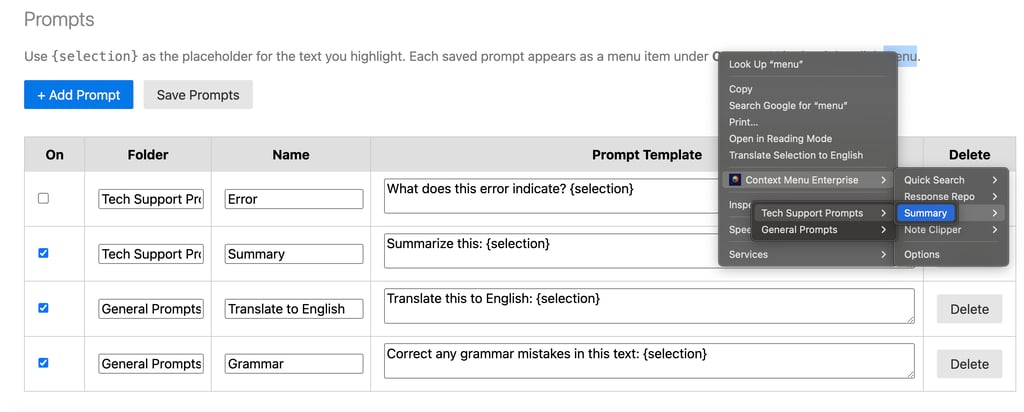 How to run AI prompts on selected text directly from the right-click menu without leaving the page.