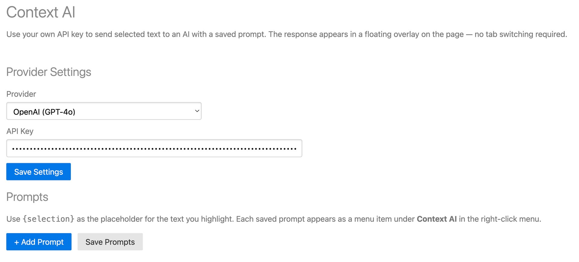 When the provider and key are managed by your admin, those settings will be locked in your options tab. You can still add your own personal prompts — they will run using the org's API key alongside any managed prompts your admin has pushed.
