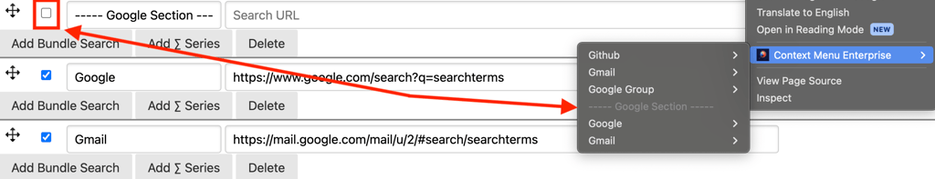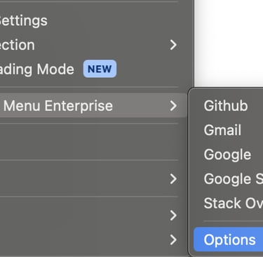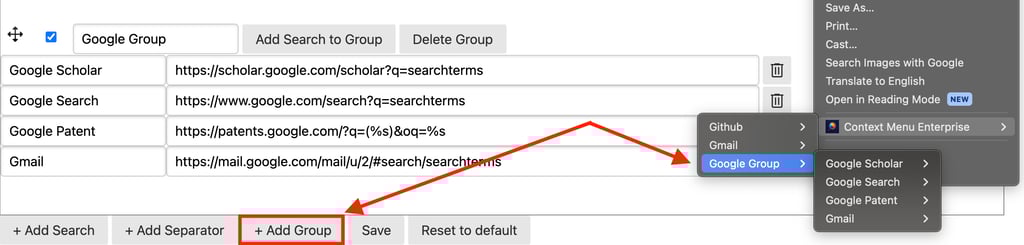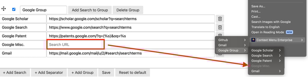 It's highly recommended to organize your menu into logical groups to maximize efficiency for you and your team. Making your team more efficient is our mission here at Context Menu Enterprise, and we'd hate to see your team adding extra seconds every time they search just because your menu is messy, unorganized, and hard to read.Create groups (aka folders) to organize primary types of searches. For example, all of your Salesforce searches can go in one group, Kibana can go in another, Public searches in another, etc. How you organize is ultimately up to you and the searches your team uses, but we recommend taking advantage of this feature in whatever way makes sense for your team.