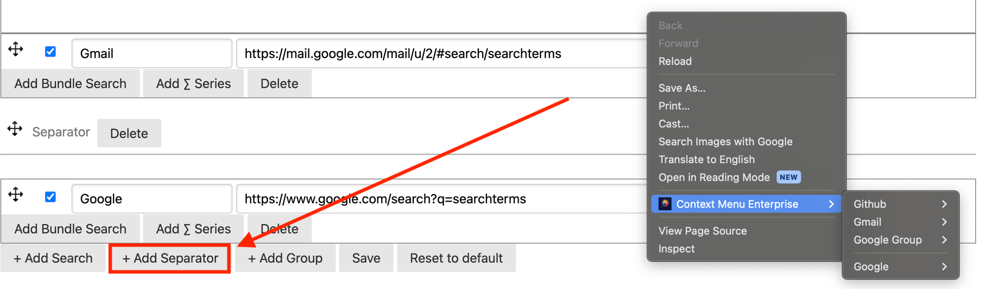 Another way to organize your Quick Search menu is by creating sections with separators. To add a separator, simply click the + Add Separator button, then drag 'n drop to your desired menu position and click Save.