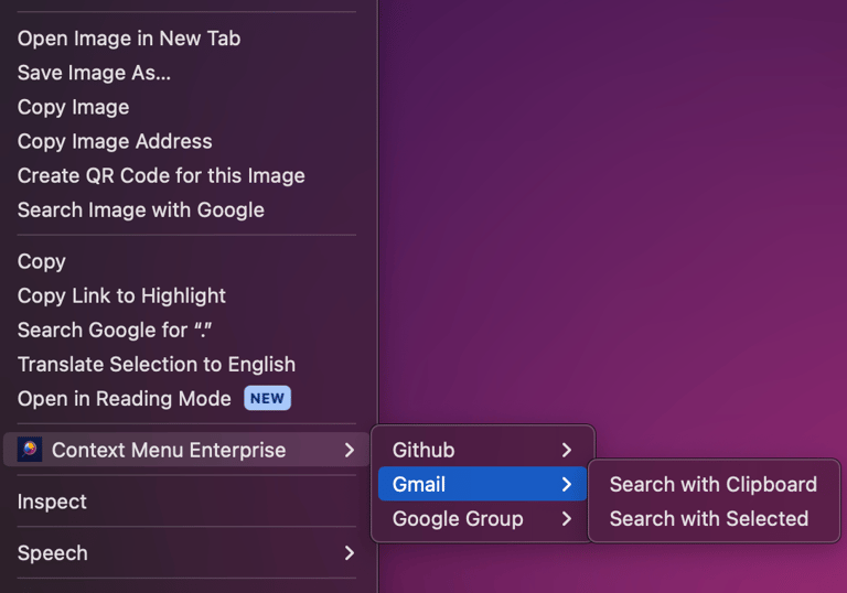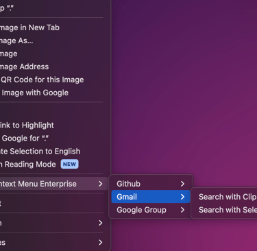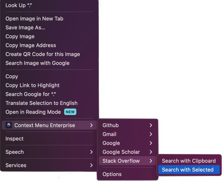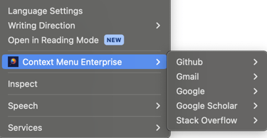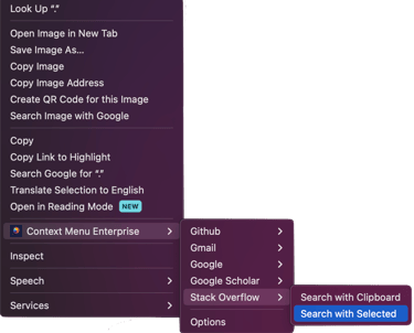 Below are some general tips and things to watch out for when using Quick Search.Depending on the webpage you're viewing, the right click menu may be different. In order to use Quick Search, you need to right click on a page which opens your browser's context menu. Some programs and websites have overlays which will show their own context menu (e.g. Google Sheets) and you won't see Context Menu Enterprise listed.