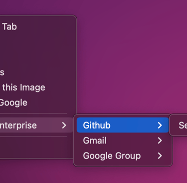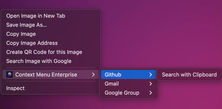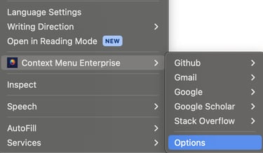 If you are searching with clipboard, right click anywhere in your browser window to open your context menu (this may need to be a non-input / editable section of the webpage),Move your cursor over Context Menu Enterprise in your context menu, and you will see your Quick Search menu open up.