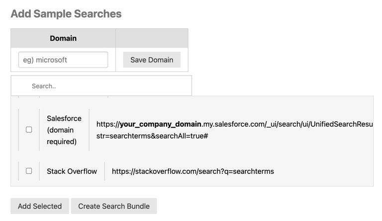 As you may already know, non-publicly accessible searches (e.g. internal databases) require your enterprise's domain within the URL to work. The Sample Search Domain Configuration allows your team to configure this domain, so it will be automatically populated when you add the search to your menu.