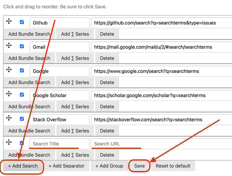 Click the "Add Bundle Search" button in the menu line you have added / selected. You will see a new empty Search URL field appear below the existing one.