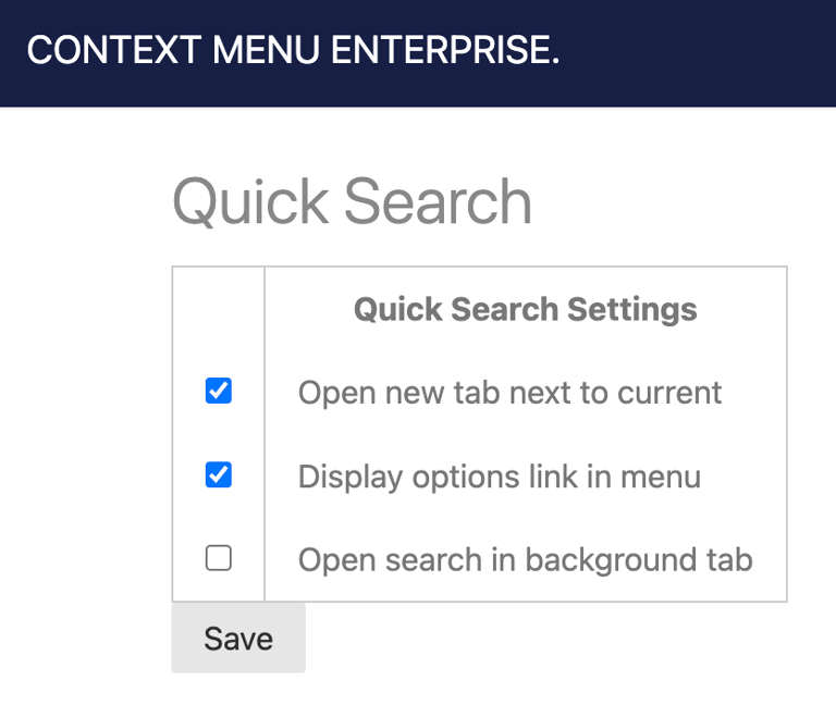 To get started with Quick Search, you'll need to install the Context Menu Enterprise Google Chrome extension or Firefox add-on, then activate your 30 day free trial or pay for your subscription. For more details on this, see our Getting Started docs.