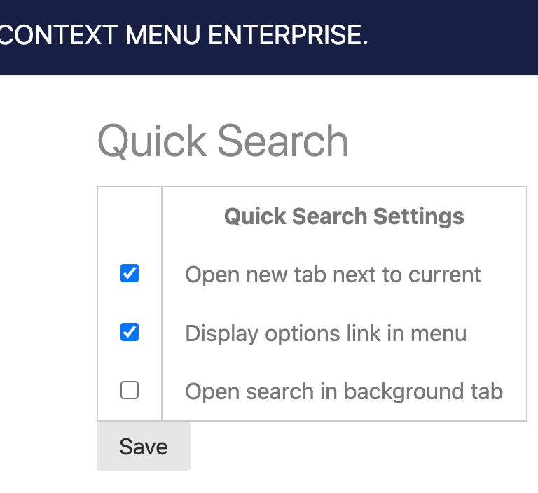 When enabled, this setting adds a link to your Options & Configuration page at the bottom of your Quick Search menu (only visible when you open up your right-click / context menu) for quick access.