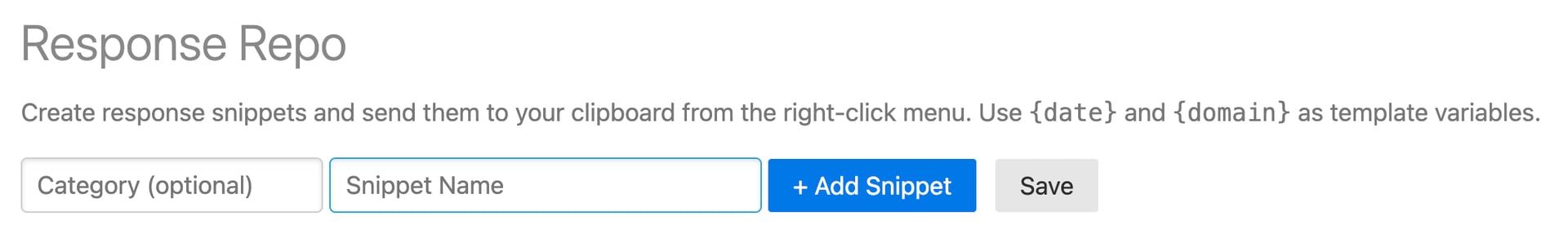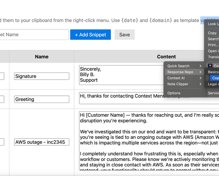 Response Repository lets you save frequently used text — support responses, scripts, email templates, SOPs, canned replies — and paste them directly into any text field with a single right-click. No more switching to a doc, finding the right response, copying, and switching back.